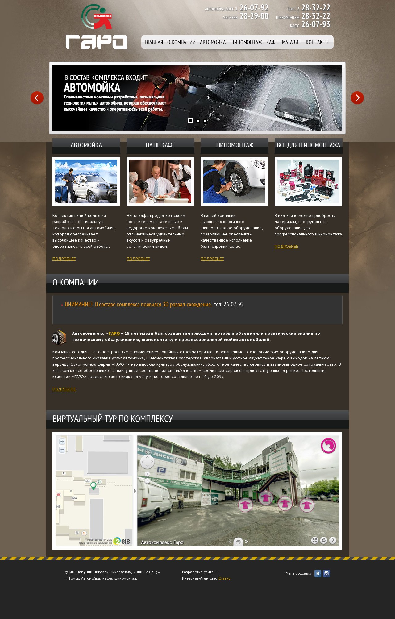 Специализированный автокомплекс в Томске. Объединяет функции профессионального сервисного центра и поставщика гаражного оборудования. Работает на рынке более с 2008 года, предоставляя услуги по обслуживанию легкового, грузового и сельскохозяйственного транспорта. Предлагает полный спектр шиномонтажных работ любой сложности: от сезонной замены резины и балансировки (включая мототехнику) до сложного ремонта боковых порезов и реставрации дисков методами правки и аргоновой сварки. Располагает постами для бесконтактной мойки, химчистки салона и полировки кузова, а также оказывает услуги по сезонному хранению шин. Реализует профессиональное оборудование для автосервисов и расходные материалы ведущих брендов (Rossvik, Tech, Stormbalance), обеспечивая техническую поддержку бизнеса. Дополнительно предоставляет спецтехнику, включая услуги фронтального погрузчика и ассенизаторской машины.