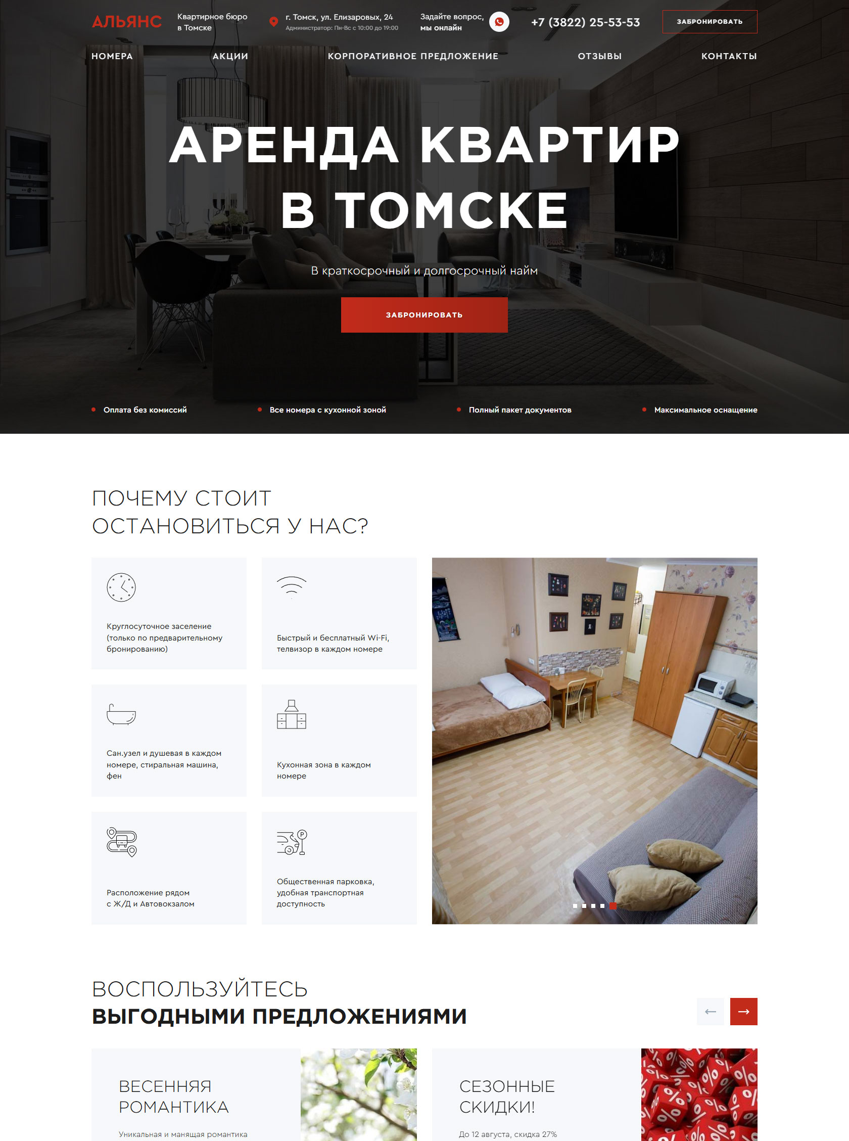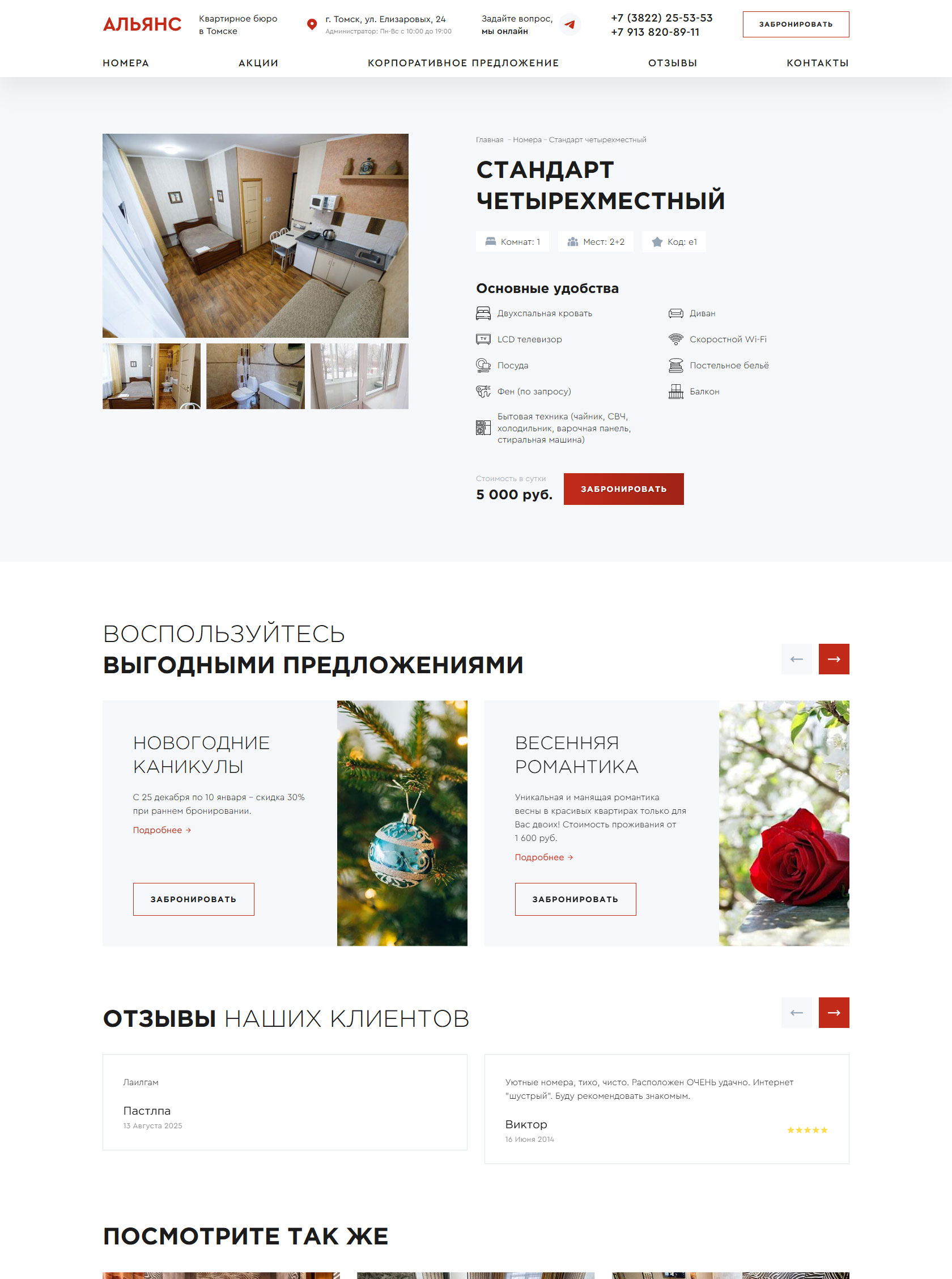 Специализированный сервис размещения в Томске, объединяющий форматы классической гостиницы и квартирного бюро. Располагается в непосредственной близости от вокзала Томск 1 и предлагает гостям комфортабельные номера квартирного типа, оборудованные собственной кухонной зоной и всей необходимой бытовой техникой. Предоставляет гибкие условия аренды на любой срок: от почасового пребывания (минимум 3 часа) до длительного проживания без необходимости внесения залога. Для командированных сотрудников выдается полный пакет отчетных документов, подтверждающих расходы. Обеспечивает высокие стандарты чистоты и конфиденциальности: ключи остаются у гостя на все время проживания, а на территории действует бесплатный высокоскоростной WiFi. Организация также работает с корпоративными клиентами и принимает оплату на расчетный счет.