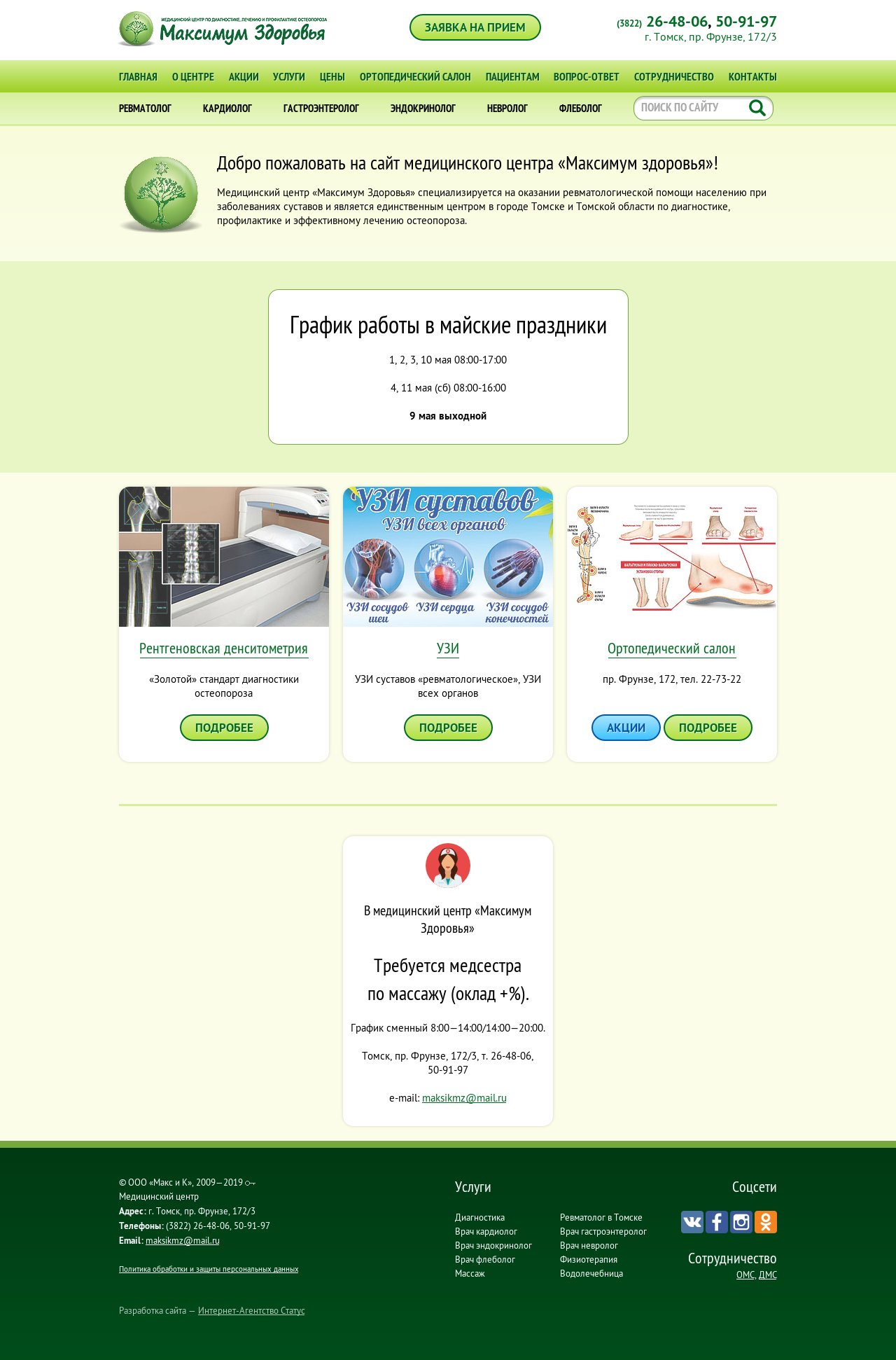 Специализированный медицинский центр в Томске, профильно занимающийся диагностикой, лечением и профилактикой заболеваний опорно-двигательного аппарата. Является единственным учреждением в регионе, предлагающим комплексный подход к выявлению и лечению остеопороза с использованием рентгеновской денситометрии. Объединяет узкопрофильных специалистов для решения сложных клинических задач: ревматологов, травматологов-ортопедов, неврологов, кардиологов и эндокринологов. Предоставляет полный спектр диагностических услуг, включая УЗИ суставов, сосудов и внутренних органов, а также лабораторные исследования. Работает на рынке медицинских услуг с 2009 года, применяя современные методики терапии и индивидуальные планы реабилитации пациентов.