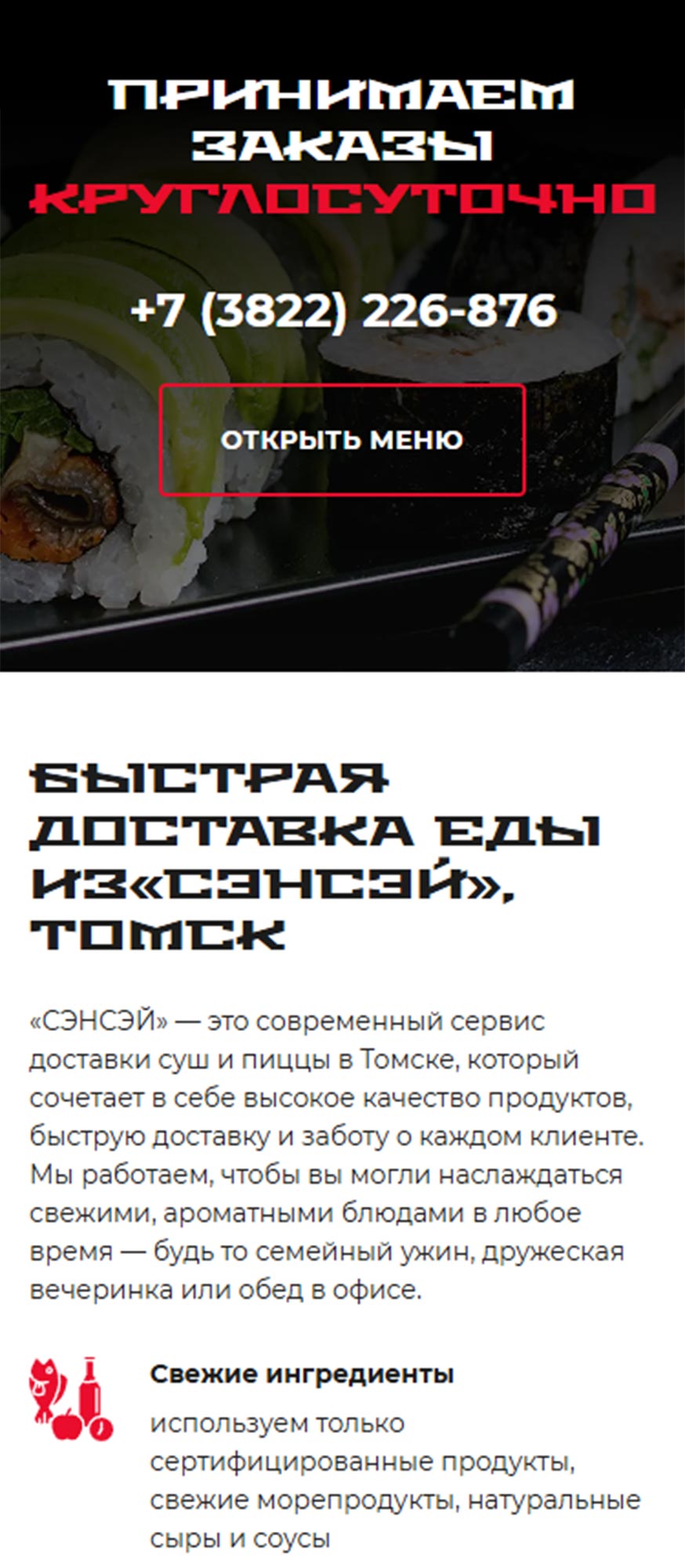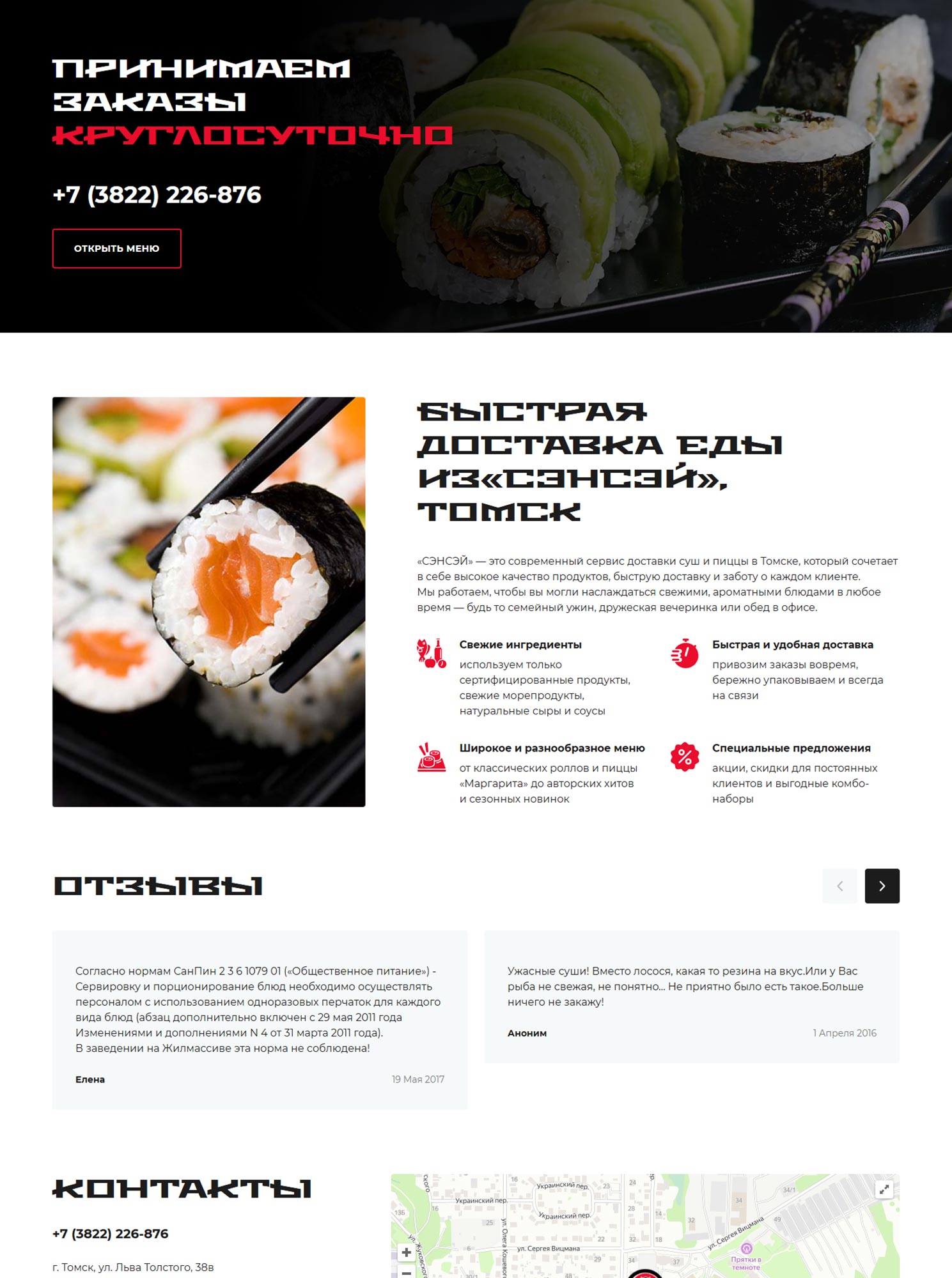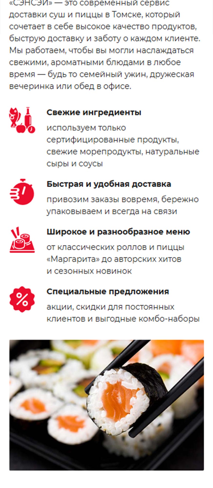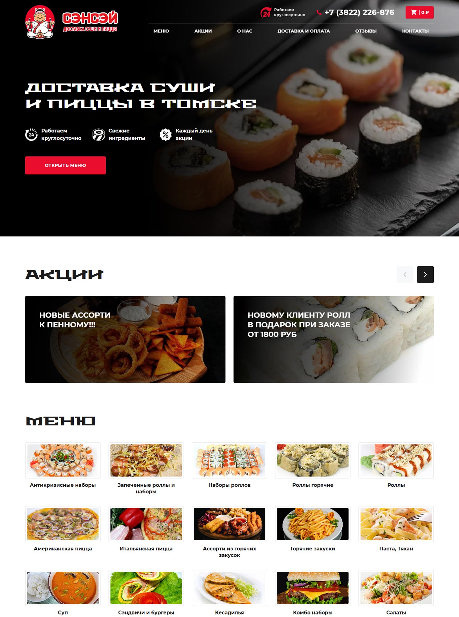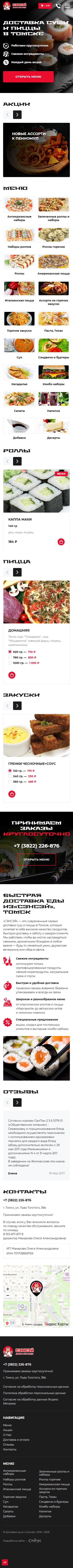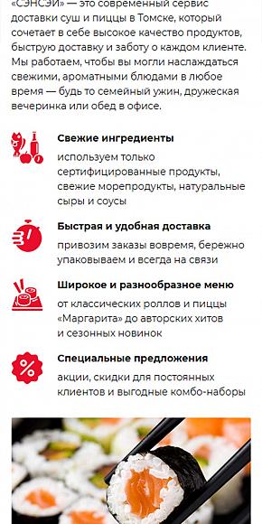 Специализированный сервис круглосуточной доставки японской и итальянской кухни в Томске, предлагает обширное меню, включающее разнообразные виды суши и роллов, пиццу на тонком тесте, вок-лапшу, салаты и десерты. Осуществляет прием и развоз заказов 24 часа в сутки, обеспечивая клиентов свежеприготовленной едой в любое удобное время. Гарантирует использование сертифицированных продуктов высокого качества и строгое соблюдение рецептур на протяжении многих лет. Предоставляет услугу бесплатной доставки при сумме заказа от 1300 рублей, а также обслуживает отдаленные районы (до 23 км от города). Для именинников и при крупных заказах действуют специальные акционные предложения и подарки.