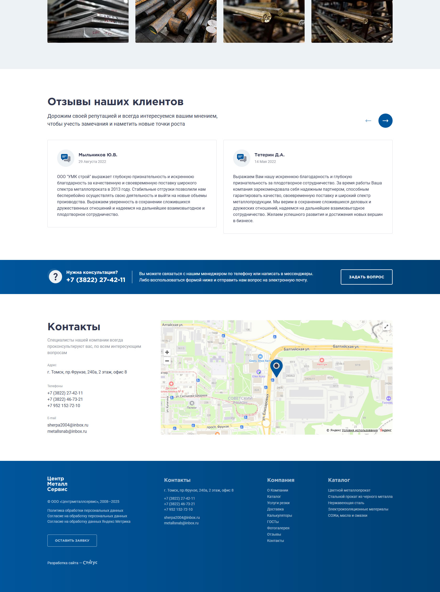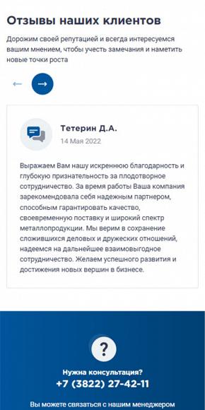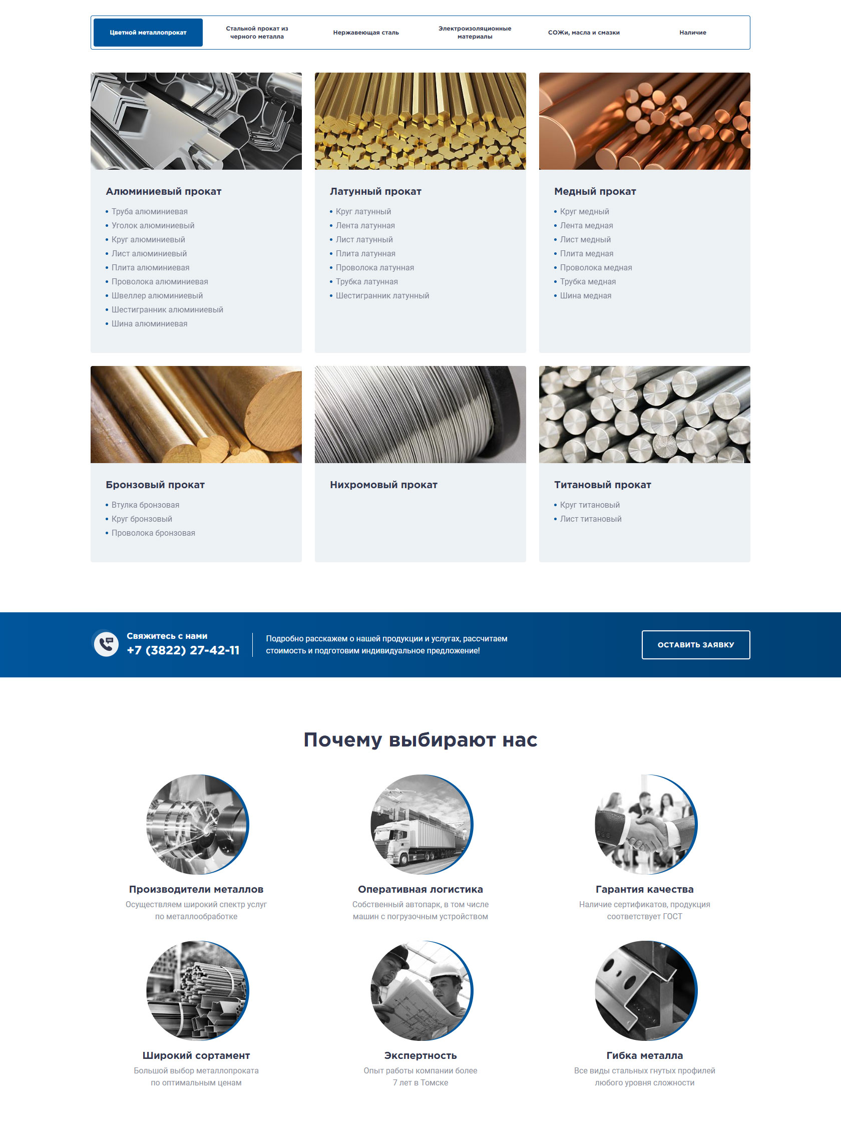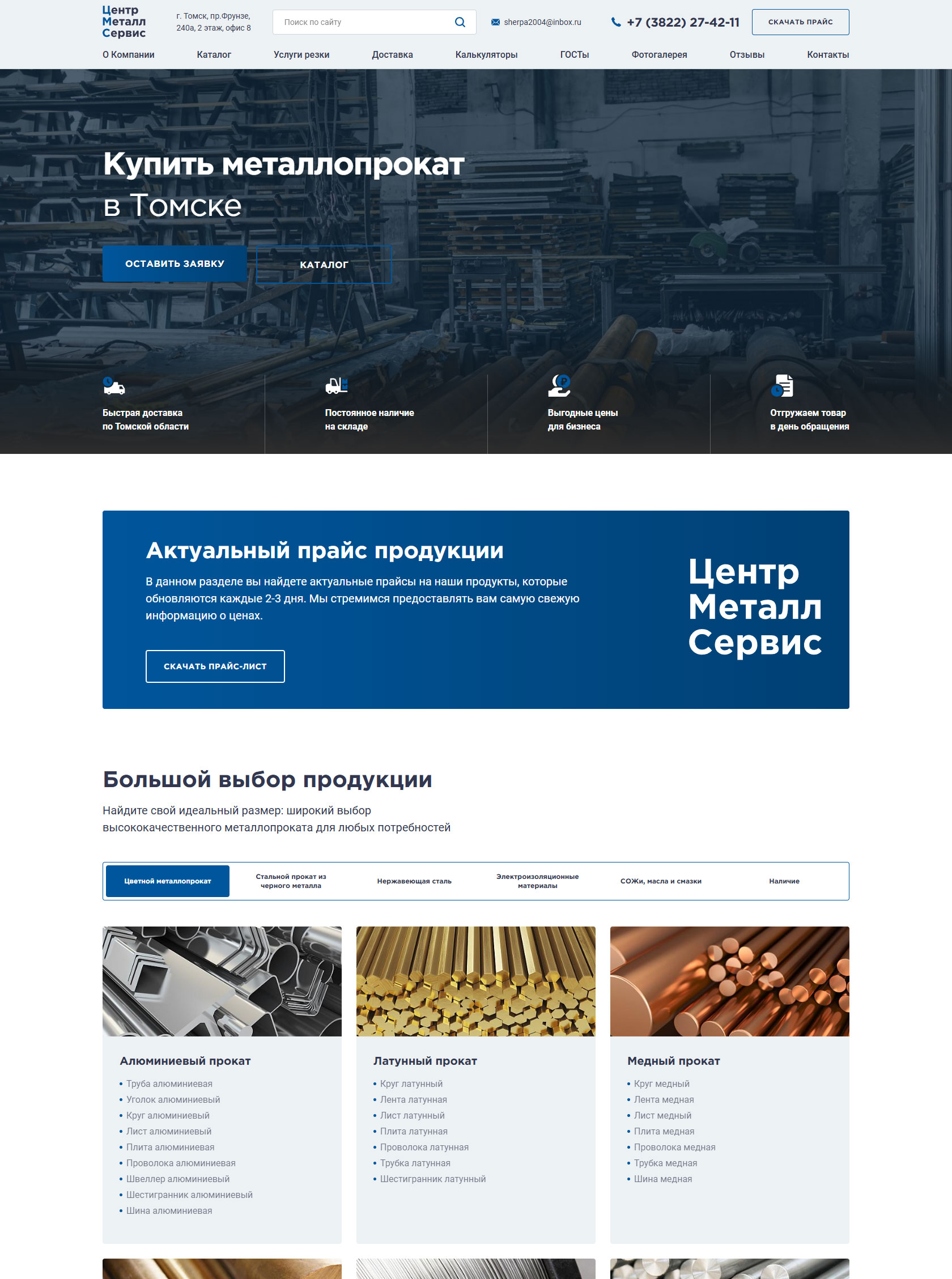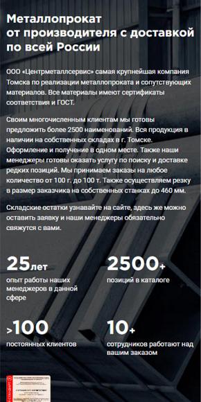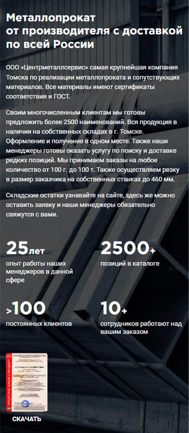 Крупнейший поставщик металлопроката в Томске, специализирующийся на оптовой и розничной реализации черного, цветного и нержавеющего металла. Ассортимент насчитывает более 2500 позиций, включая алюминий, медь, латунь, бронзу, титан, а также электроизоляционные материалы и смазочно-охлаждающие жидкости. Обеспечивает наличие продукции на собственных складах и предоставляет услуги по резке металла в размер заказчика (на станках до 460 мм). Принимает заказы любого объема — от 100 грамм до 100 тонн, гарантируя отгрузку в день обращения и оперативную доставку собственным автопарком. Вся реализуемая продукция сертифицирована и соответствует стандартам ГОСТ. Команда менеджеров с опытом с 2008 гоработы в сфере металлопроката оказывает профессиональную поддержку в подборе материалов и поиске редких позиций.